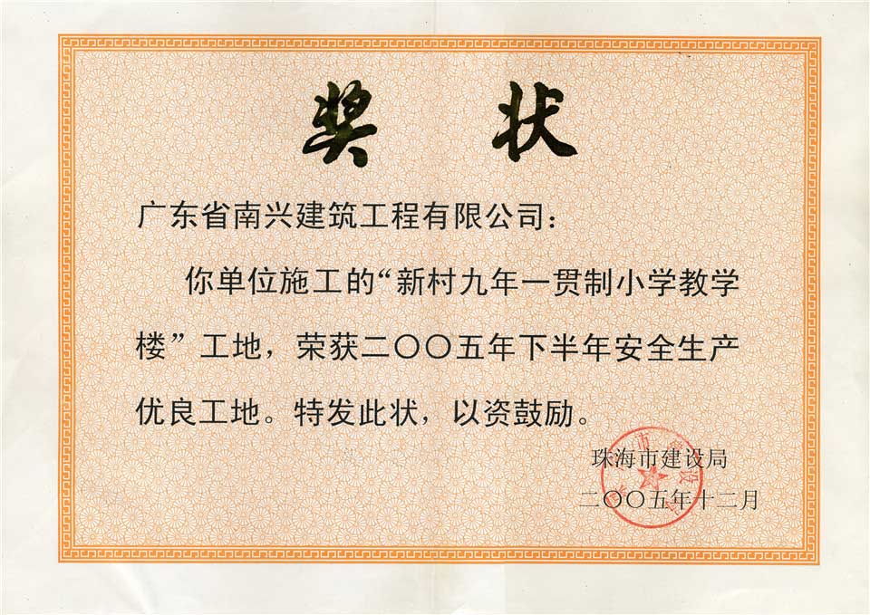 2005年珠海市下半年安全生產(chǎn)優(yōu)良工地